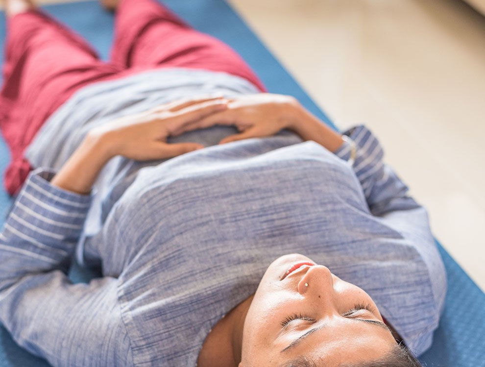 - Poggia le mani sull’addome, inspira ed espira solo con le narici, lasciando la bocca socchiusa a riposo e prova a percepire il movimento dinamico e ritmico della pancia: l’ombelico si allontana gonfiando l’addome nella fase di inspirazione e si ritrae internamente nella fase della espirazione.